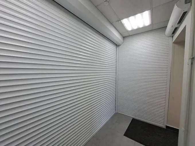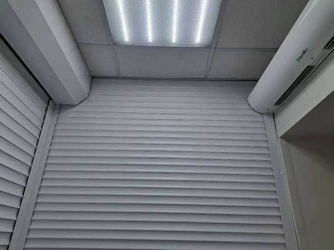 В нерабочее время потребовалось закрытое помещение для банкомата. Стеклянные перегородки решили закрыть роллетами.